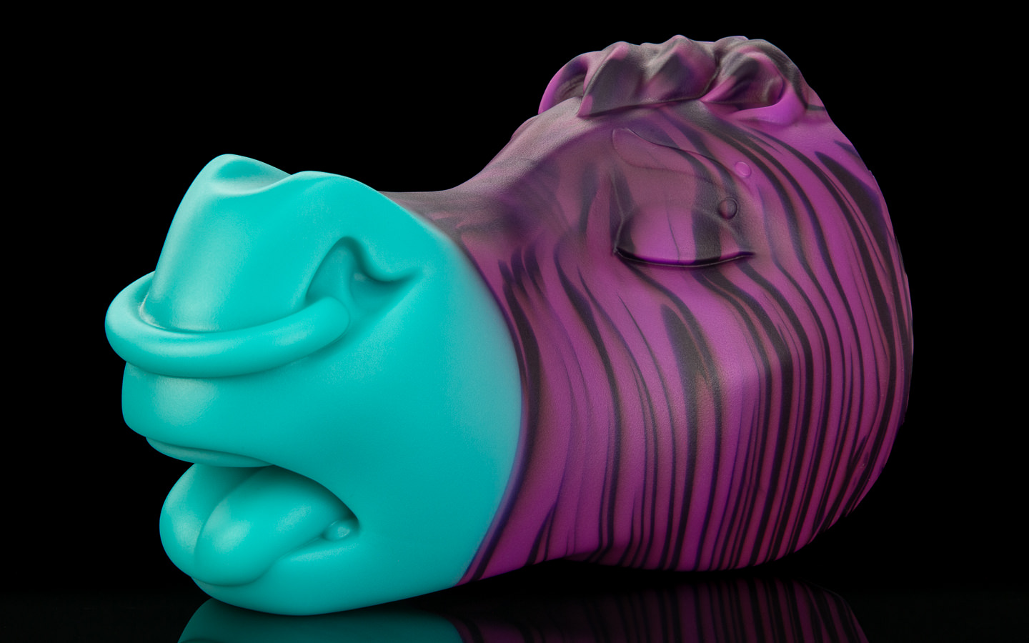 A cute unicorn colouration; His face is swirled between a sparkling white, purple and sky blue before smoothly transitioning to a pink muzzle.