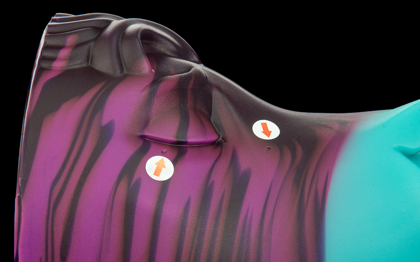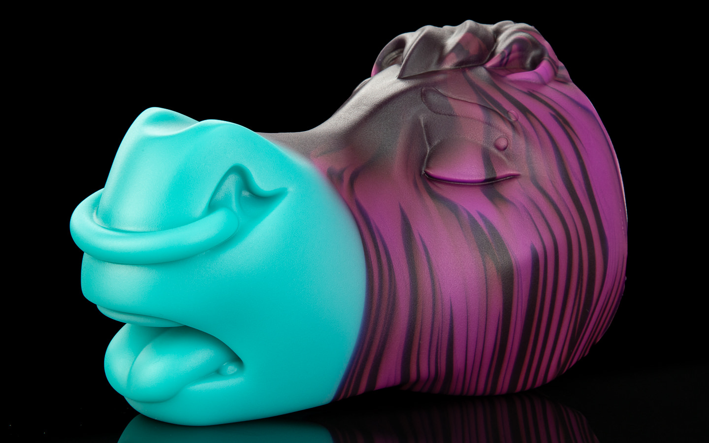 A cute unicorn colouration; His face is swirled between a sparkling white, purple and sky blue before smoothly transitioning to a pink muzzle.