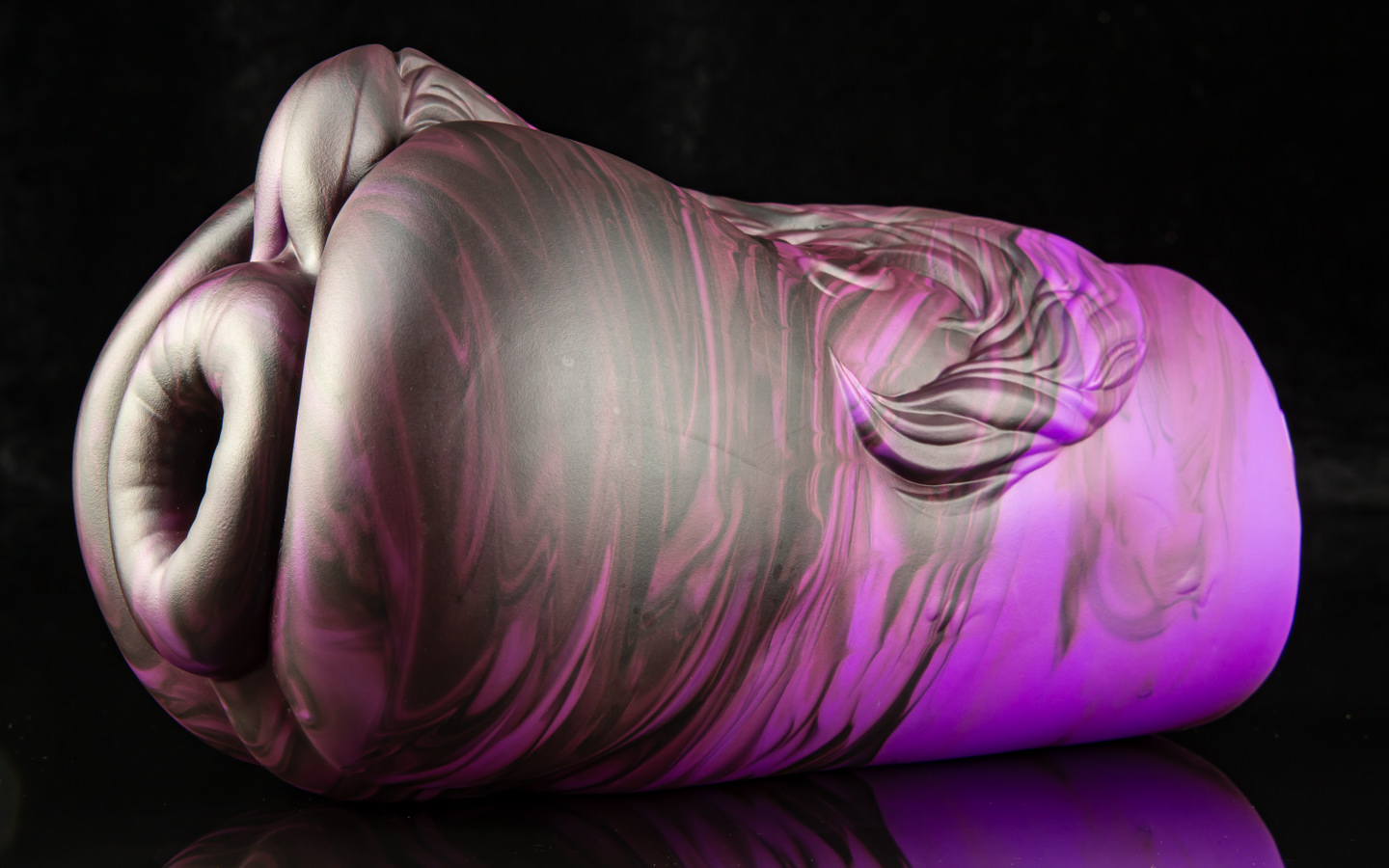 We've delivered three main colourations for Jack's butt. The first, a unicorn-esque look, with a swirl of pearlescent blue, pink and white. Jack's signature is cast in three stages, first the black donut, then his cheeks and belly, and finally a main body with a fuzzy 'sheen' to it. We're also offering him in Silverfox, with a lovely, deep black hole and belly plus a swirled grey-on-black body!