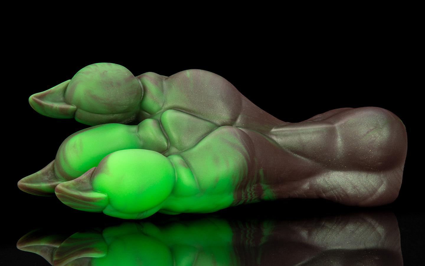 In the final product, we think we got pretty close to the real thing! His toes compress and deform to the touch in a lovely way, the body/ball of the foot has a sturdy firmness to it, and the scale and tendon details strewn up and down him make for a luxurious feel. If he were a human, he'd be about a 13 shoe size - in their resting position, the toes and pads are wide enough to completely cover your eyes. It really is the closest you can get to a dragon’s hindpaws.