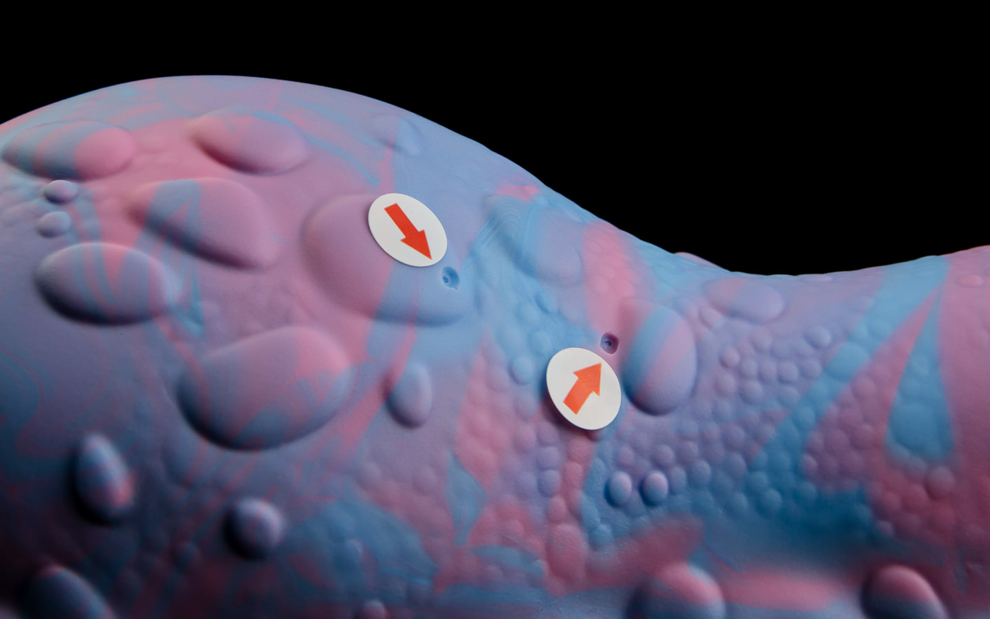 We’ve designed two primary styles for Sapphire; her Signature, and her Natural. The signature is a lovely fade between a darker and lighter blue, punctuated by a white belly and hindquarters. For her natural, we cast a thin layer of white silicone over the entire toy and then swirl between pastel blue and pink colours underneath – with the white rotocast adding contrast to her scale detail.