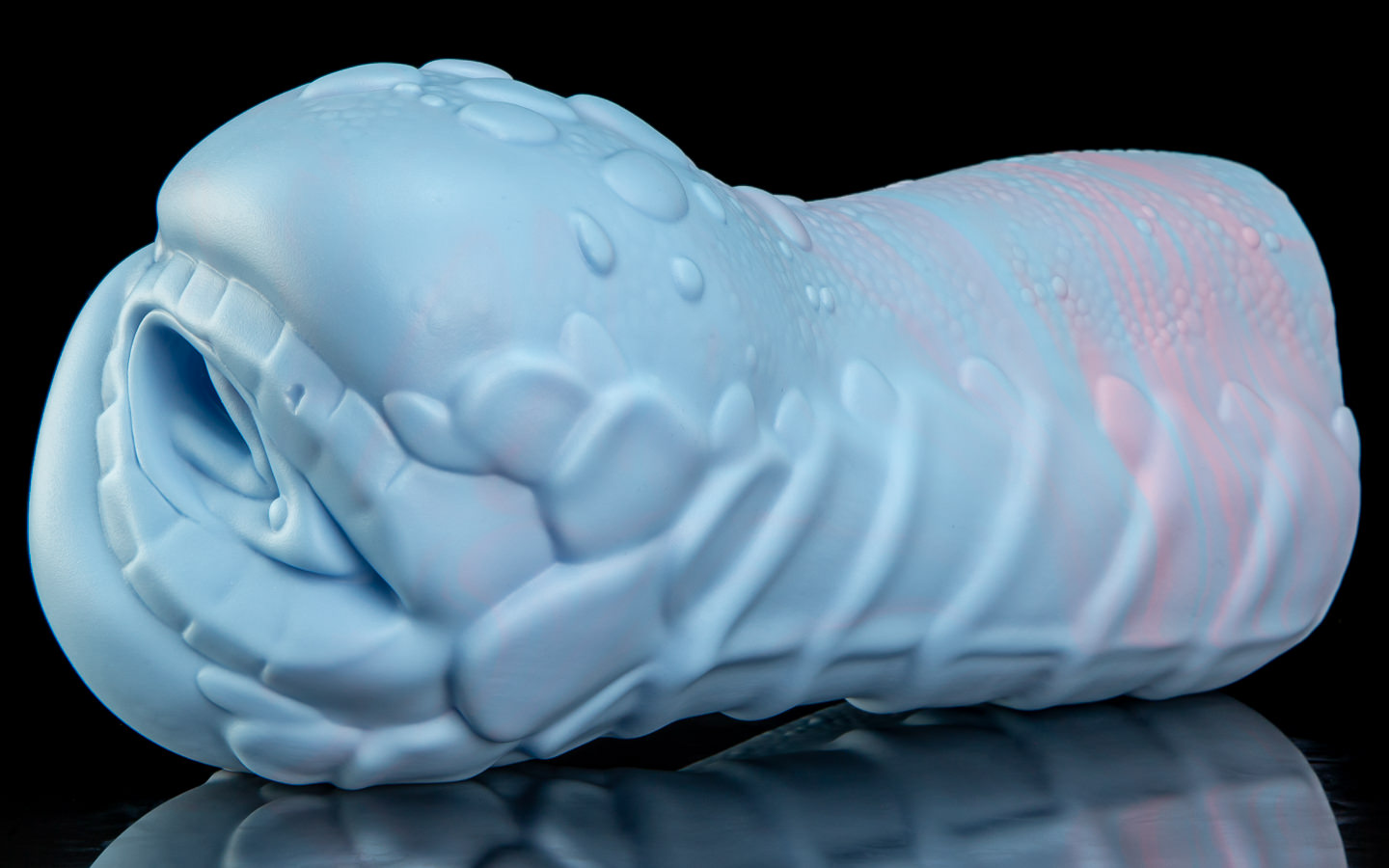 We’ve designed two primary styles for Sapphire; her Signature, and her Natural. The signature is a lovely fade between a darker and lighter blue, punctuated by a white belly and hindquarters. For her natural, we cast a thin layer of white silicone over the entire toy and then swirl between pastel blue and pink colours underneath – with the white rotocast adding contrast to her scale detail.
