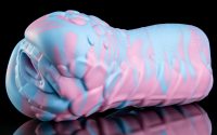 We’ve designed two primary styles for Sapphire; her Signature, and her Natural. The signature is a lovely fade between a darker and lighter blue, punctuated by a white belly and hindquarters. For her natural, we cast a thin layer of white silicone over the entire toy and then swirl between pastel blue and pink colours underneath – with the white rotocast adding contrast to her scale detail.