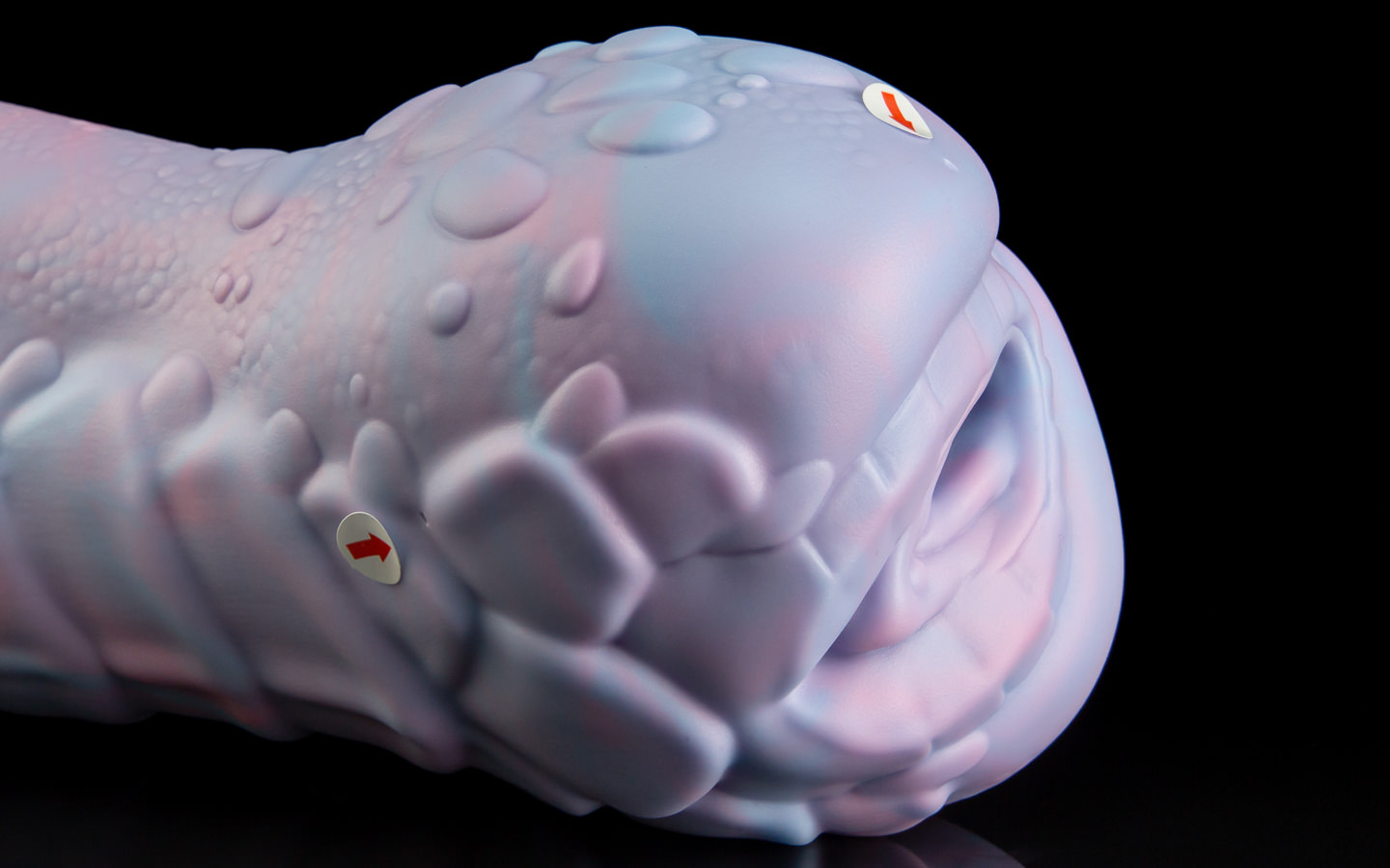 We’ve designed two primary styles for Sapphire; her Signature, and her Natural. The signature is a lovely fade between a darker and lighter blue, punctuated by a white belly and hindquarters. For her natural, we cast a thin layer of white silicone over the entire toy and then swirl between pastel blue and pink colours underneath – with the white rotocast adding contrast to her scale detail.