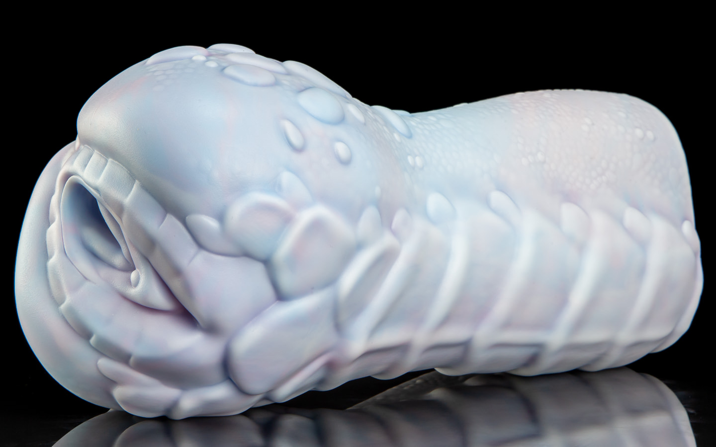 We’ve designed two primary styles for Sapphire; her Signature, and her Natural. The signature is a lovely fade between a darker and lighter blue, punctuated by a white belly and hindquarters. For her natural, we cast a thin layer of white silicone over the entire toy and then swirl between pastel blue and pink colours underneath – with the white rotocast adding contrast to her scale detail.