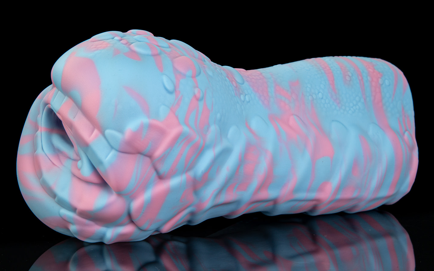 We’ve designed two primary styles for Sapphire; her Signature, and her Natural. The signature is a lovely fade between a darker and lighter blue, punctuated by a white belly and hindquarters. For her natural, we cast a thin layer of white silicone over the entire toy and then swirl between pastel blue and pink colours underneath – with the white rotocast adding contrast to her scale detail.