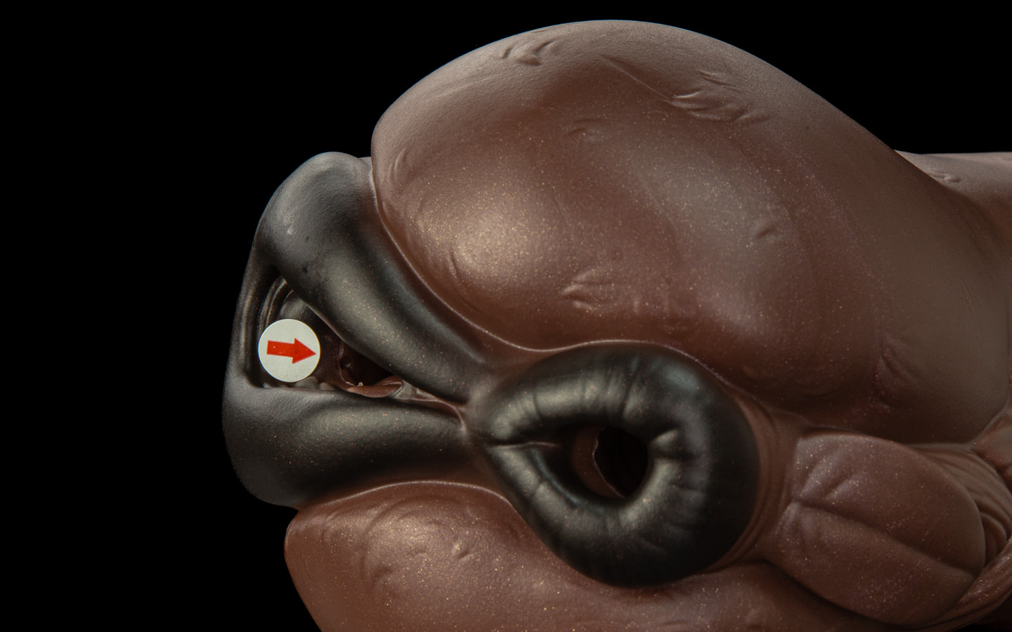 Pressing it inward, her pucker compresses first, the vibration you’re imparting to her body making lining it up a little awkward. But with a little determination and some well placed force, you manage to get her to spread over it.