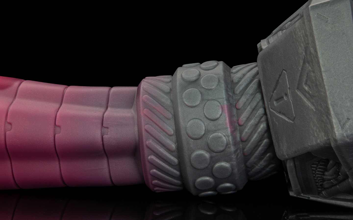 The base is a dark steel and red swirl.