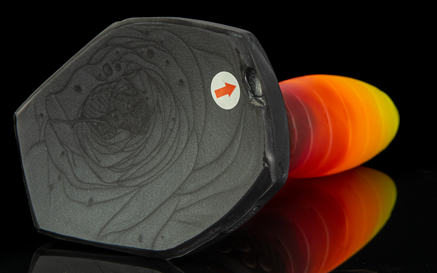 The base is a dark steel and red swirl.