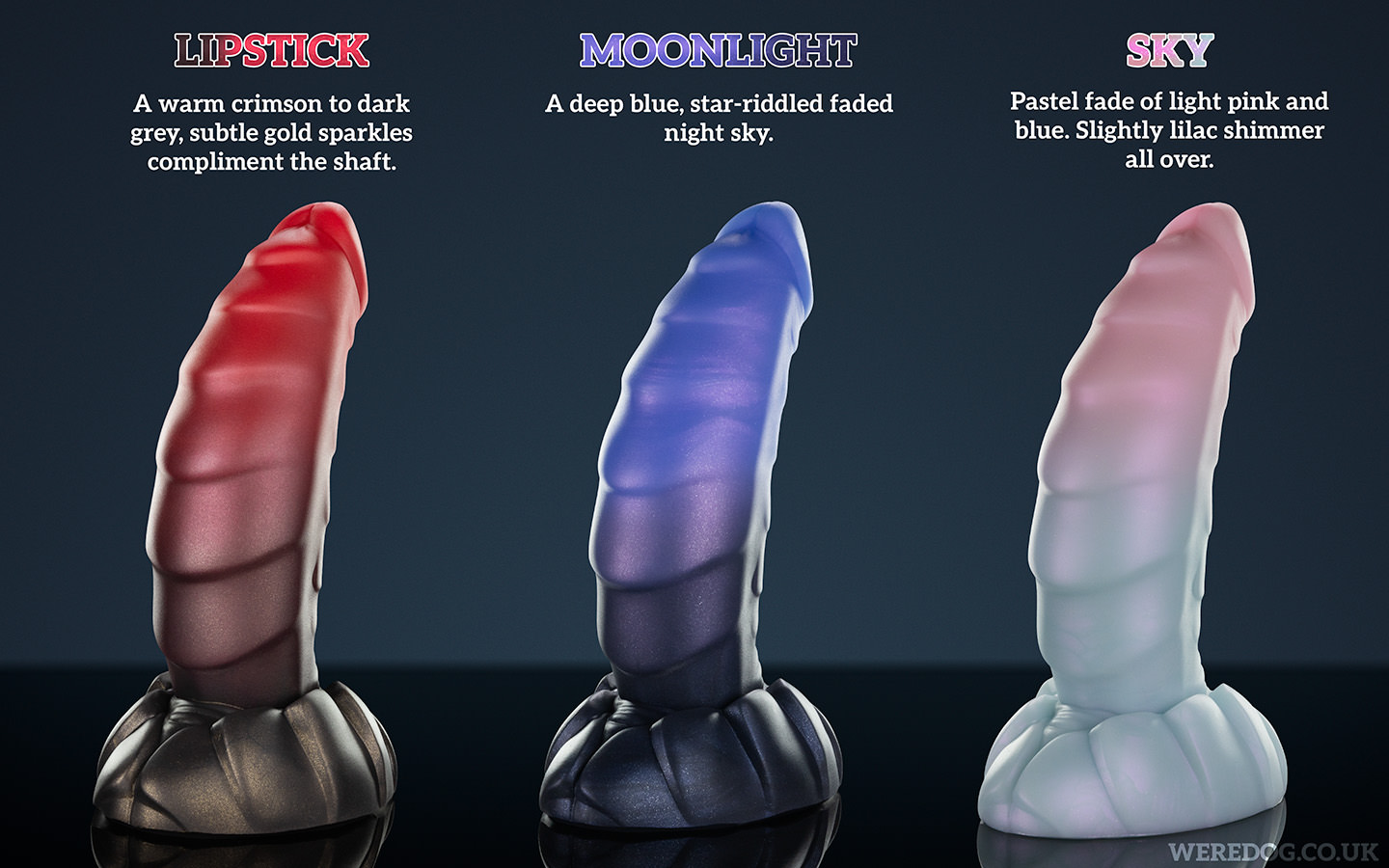 Skylar features a progressively thick shaft, with smooth stepped ridges. A lovely curve shape to hit all the right buttons. His tapered natured makes him a good beginner toy or, in larger sizes, a great toy to train girth and stretching~ The subtle texture allows you to track your progress as you take on this large drake. When hilted, his curve presses tightly against all the right spots, and the ridges only highlight that. It's base is nice and large, easy to hold or place down, and the open slit compliments nicely the rest of the draconic features. Skylar features a progressively thicker shaft, with smooth stepped ridges and a lovely curved shape to hit all the right buttons. His tapered nature makes him a good beginner toy or, in larger sizes, a great toy to train girth and stretching~ The subtle texture allows you to track your progress as you take on this large drake. When hilted, his curve presses tightly against all the right spots, and the ridges only highlight that. It's base is nice and large, easy to hold or place down, and the scaly slit compliments the rest of the draconic features.