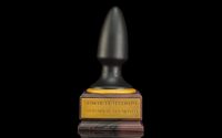 We wanted this toy to be as accurate as possible, so our production staff have gone above and beyond; the “plug”, plaque and gold ring are all poured separately from black and gold silicone, then the base is poured using a black and brown swirl to emulate wood texture. In person, it hardly even looks like its entirely silicone until you pick it up.